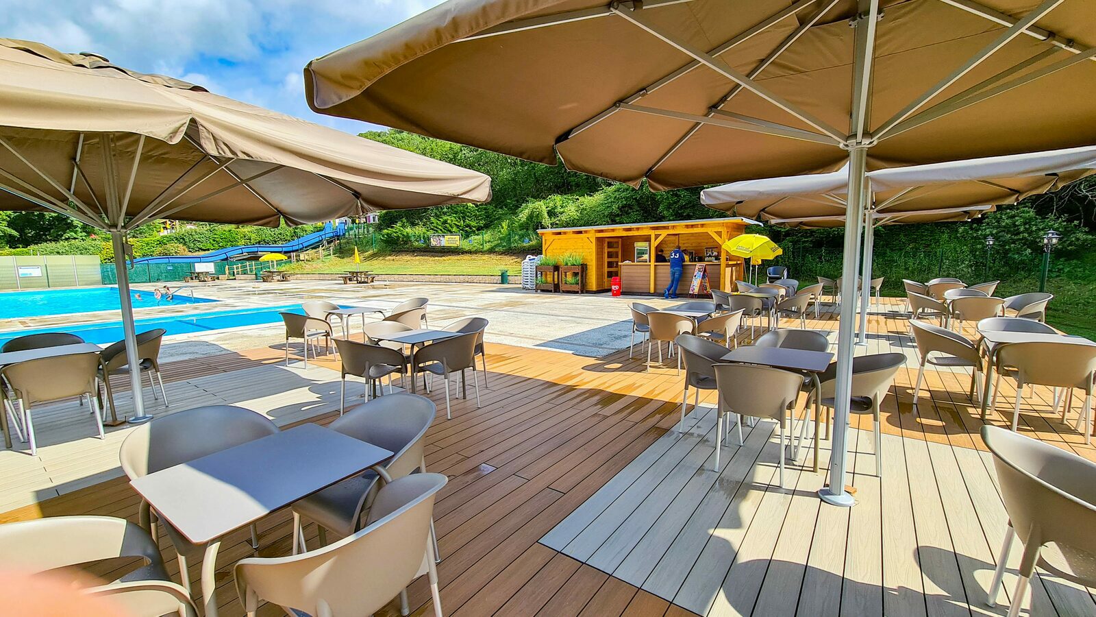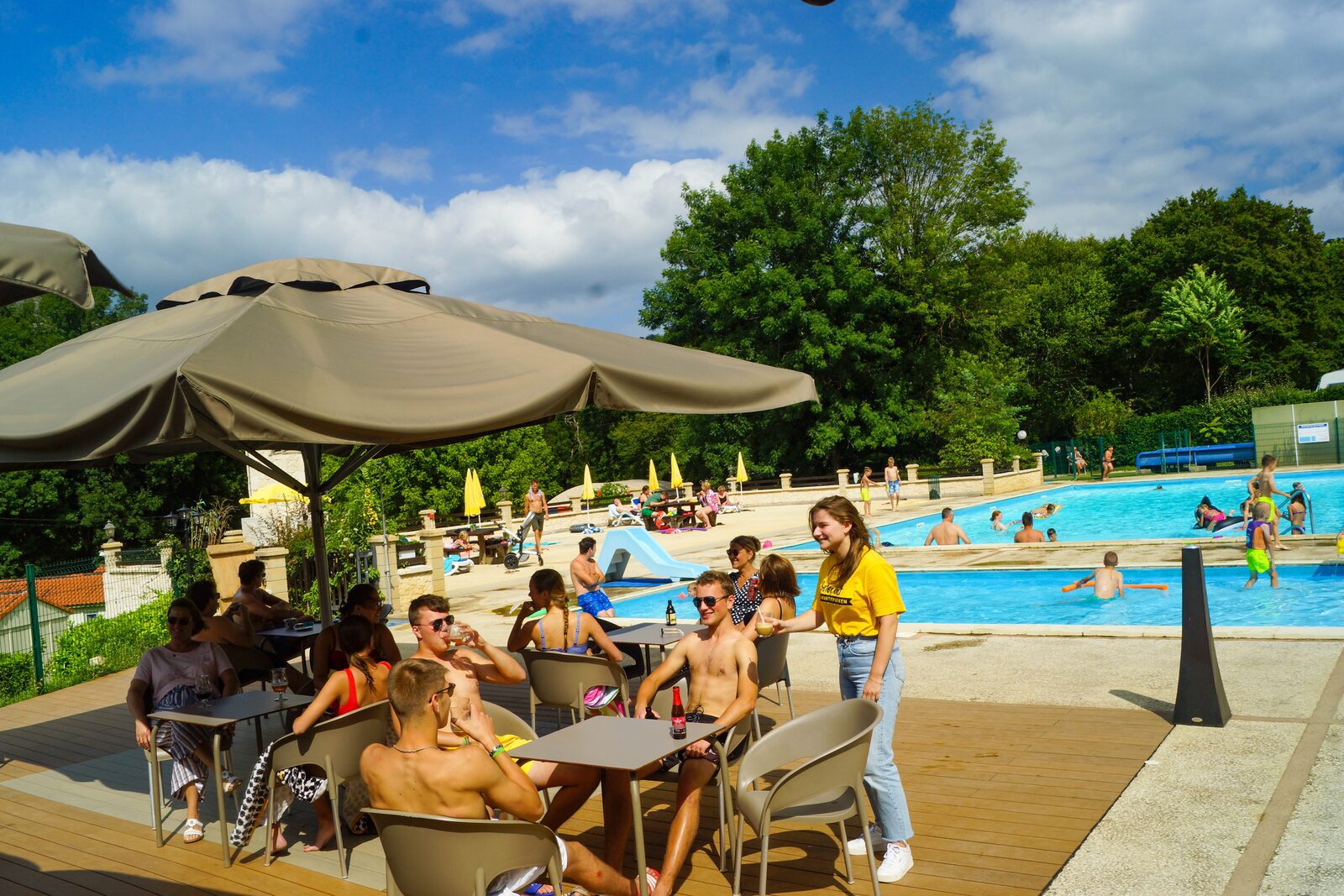 Naast de snackbar ben je ook inzetbaar op het terras van het zwembad ‘La Terrasse’. Hier voorzie je de gasten van diverse snacks, drinken, een panini of een verfrissende ijskoffie in de middag en 's avonds van drankjes en snacks tijdens één van de avondactiviteiten.